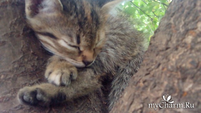 Дома уже какой раз говорят, чтобы больше никого не притаскивала. А тут только отдала одного... Нашла малышку спящую на дереве, на пяточке, где мы кошек кормим.