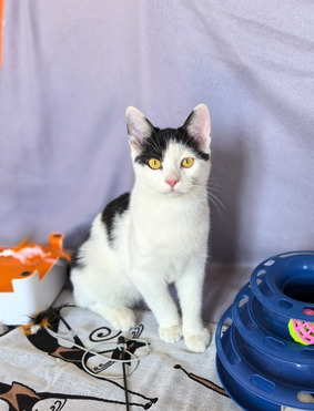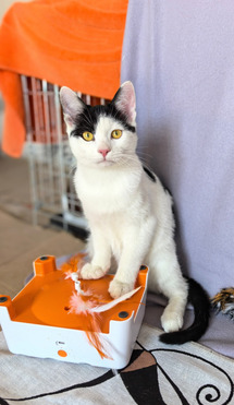 Вцелом, отличный котёнок: активный, ласковый ( рано лишился мамы), любит сидеть на ручках. Сам запрыгивает и начинает урчать от удовольствия, как трактор. Подойдёт семьям с детьми, будут вместе играть. Не кусается, не царапается.