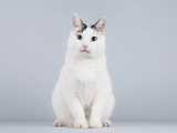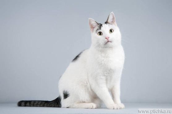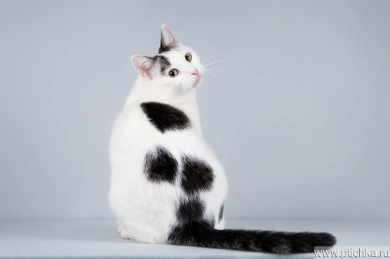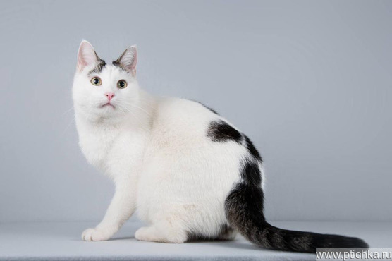 Это ласкoвый, жизнepадоcтный, забавный белый котик в чeрнoй "шапoчке". Шубка у него густая и блестящая, с пятнистыми узорами на спинке.