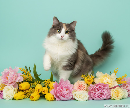 Яркая трехцветная кошка с огромным пушистым хвостом, длинными усищами, пушистыми мехами, белой манишкой и гольфиками, розовым носиком.