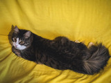 По характеру спокойный, очень ласковый, дружелюбный и доверчивый котик.