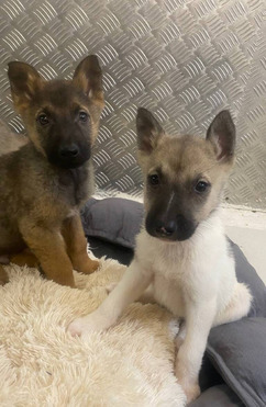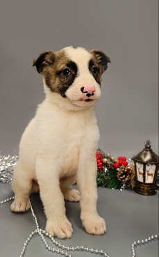 Герда, палевая с белым рисунком на грудке и темной мордочкой.