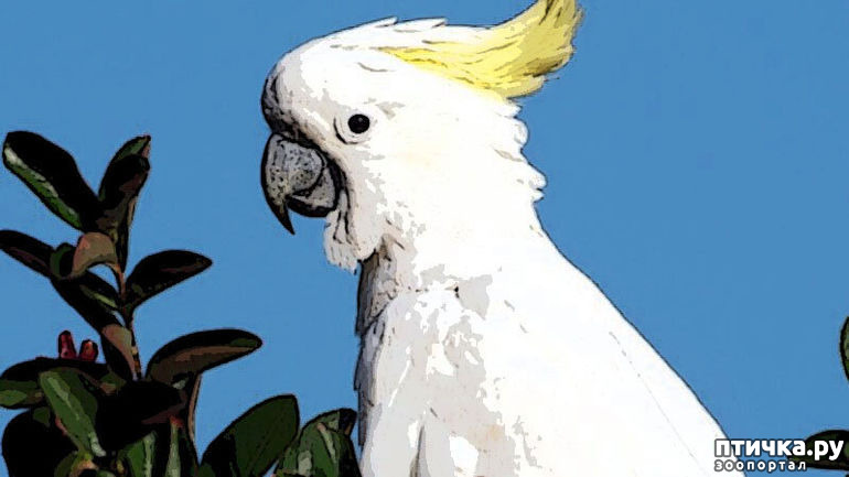 Вороны называли его Охотник. И дело было вот в чем. Он охотился на ворон. И вот каким способом. Вытащив из своей клетки вкусные попугайские банановые палочки, он укладывал их на подоконник и отходил в сторону. Когда ворона, соблазнившись такими прелестями и убедившись в том, что большая белая птица со страшным загнутым клювом отошла в сторону и дремлет, подлетала в надежде стащить корм…