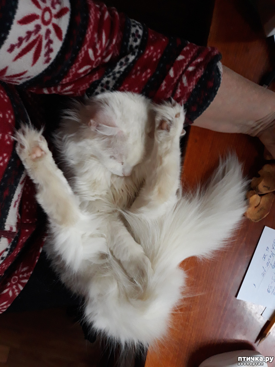 Белая въехала в наш дом 8 ноября 2017 г. и стала нашей кошкой по имени Белка. Тихая, спокойная, про туалет она не знала. Постепенно объясняю, что на 9 котов – 4 туалета, надо выбирать, привыкать… Привыкла, поняла, более проблем с туалетом не было. В тот год, как только моя младшая приходила с работы и брала её на руки, то кошка сразу обнимала лапами её за шею и начинала громко мурчать в ухо. Так же поступала и со мной. Когда я работала за компьютером, то просилась на колени и сразу же становилась на задние лапы, а передними обнимала за шею и дышала в ухо, потом начинала вылизывать. Я была против. Она соглашалась свернуться клубочком на коленях.