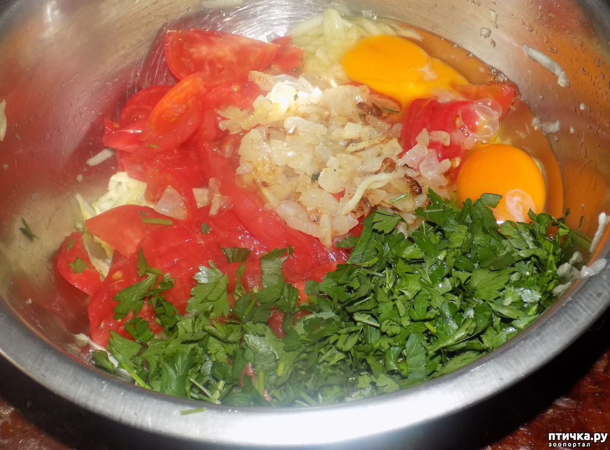Отжимаем кабачок и соединяем все ингредиенты: кабачок, зелень, яйца, лук репчатый и помидоры.