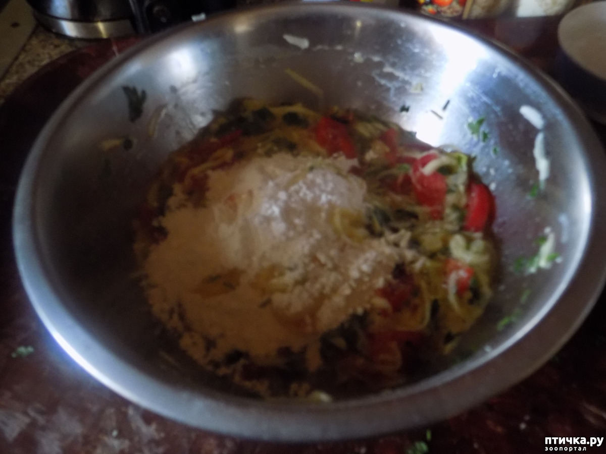 Всё хорошо перемешиваем, солим очень осторожно с учётом того, что кабачок мы уже присаливали. Поперчить на свой вкус и добавить муку. Снова перемешать.