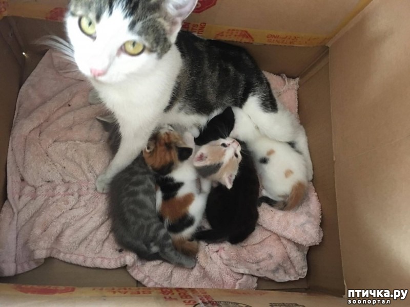 Вот так внезапно Винсент стал хозяином кошки и пятерых котят. Он поставил для кошки блюдечки с кормом и водой и кошка счастливо лежала в коробке и вылизывала свое потомство.