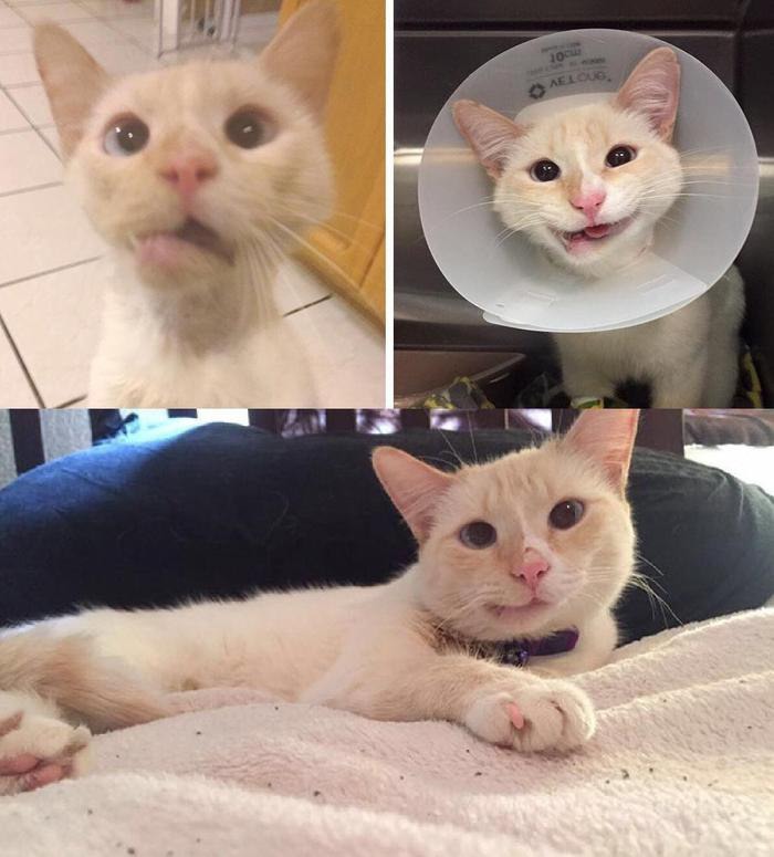 Эту кису сбила машина и у нее была сломана челюсть и лапа. Врачи сделали операцию, но им пришлось удалить большую часть зубов. Кошечка выздоровела и теперь у ее мордочки иногда глуповатое выражение. Один из оперировавших ее хирургов забрал пациентку к себе домой сразу после ветеринарной клиники и назвал ее Герцогиня Чудо-Кошка.