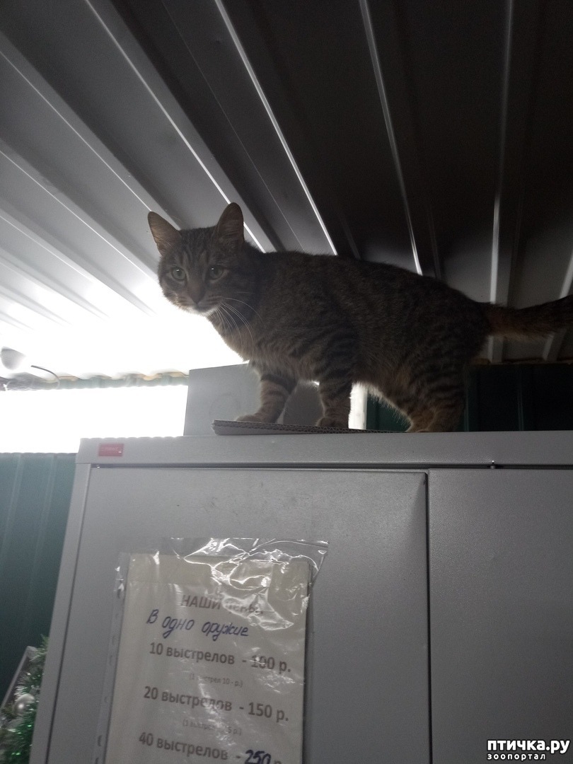 Когда стреляли клиенты не испугалась как почти все кошки, а просто спустилась в укрытие, пересидела там и вновь вышла как ни в чём не бывало)))Проверила всё что есть на хозяйстве в тире, обследовала все углы и полки