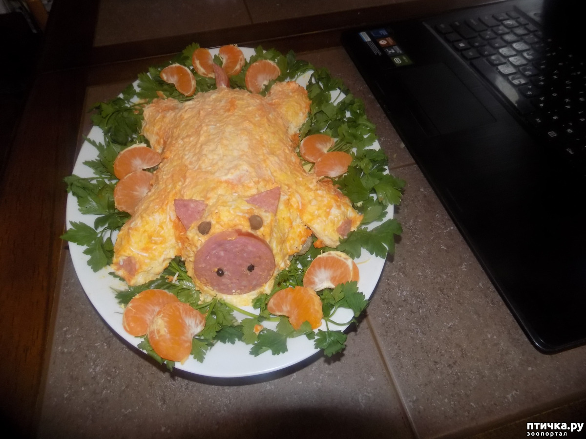 Ну, поскольку символом грядущего года будет крыса, то само собой разумеется, что присутствие этого символа на новогоднем столе будет весьма кстати. Прошлый Новый год был годом поросёнка. Я, кстати, подсмотрев где-то в интернете прекрасную идею, воплотила её в своём творческом порыве. Получилось весьма удачно. Мои гости в течение длительного времени, глядя на мой шедевр, боядлись разрушить это детище и сохраняли его целостность.