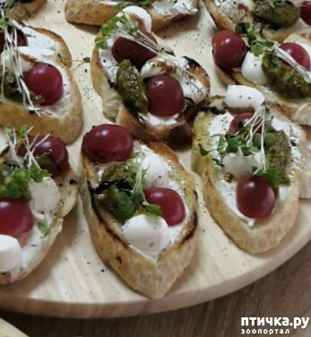Сначала мажется мягкий сыр потом кладутся по половинке порезанные помидорка моцарелла и соус песто. Ооочень вкусно.