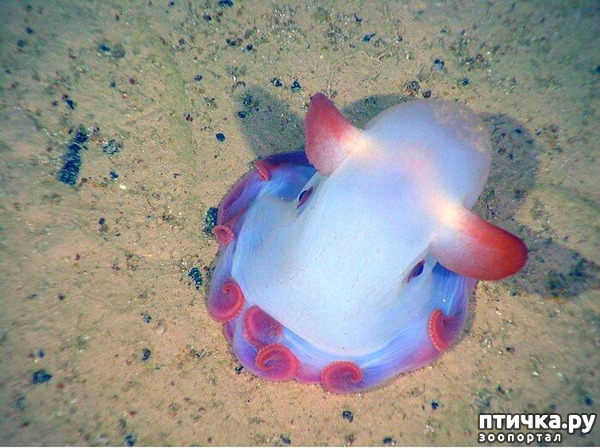 Открывает хит-парад удивительных созданий забавный осьминог. Он живет на больших глубинах (от ста до пяти тысяч метров) и занимается преимущественно поиском ракообразных и червеобразных на морском дне. Свое название, напоминающее о слоненке с большими ушами, осьминог получил благодаря двум плавникам необычной формы.