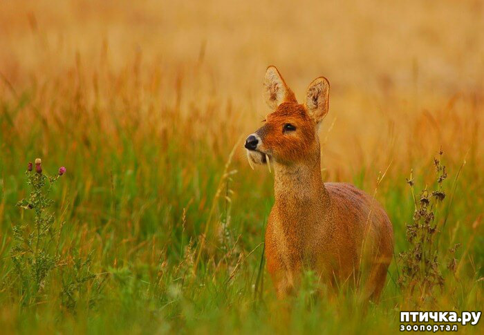 Это животное получило прозвище «Олень-вампир» за свои выдающиеся клыки, которые используются в битвах за территорию.