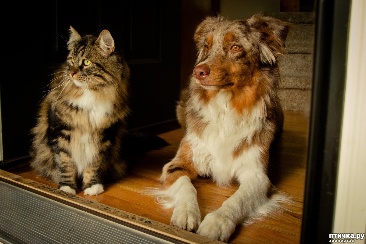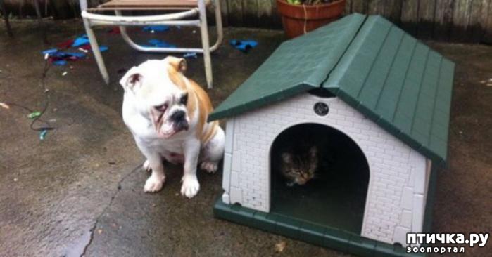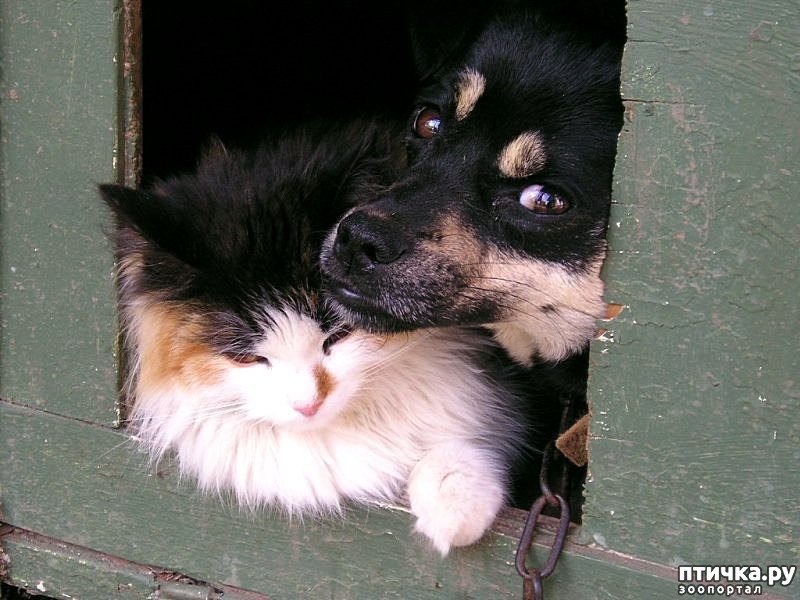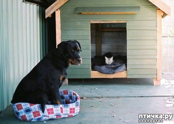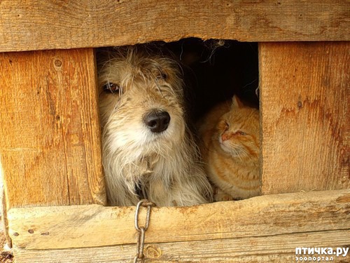 Короче. Приглянулась кошке собачья будка. Нашла с собакой общий язык и стали жить вместе. Пять лет кошка и собака - прожили мирно в одной будке. И всё у них было благополучно. Но вот рассорились, устроив переполох на всю улицу. Обе оказались на сносях практически одновременно, но кошка окотилась раньше, да ещё умудрилась это сделать в будке.