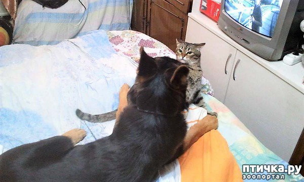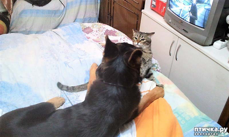 Прошли те времена, когда кошка в панике пряталась от неведомого мелкого чудища. Теперь она овчарёнку прохода не даёт. Сама лезет, сама орёт, когда её лапой прижимают и вылизывают. Получив свободу — опять трётся о собачью морду, чувствительный нос хвостом щекочет. Кейси приходит уставшая, ей бы поесть да спать завалиться.