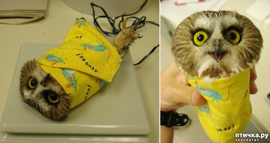 Вот так мило укутывают совушек во время взвешивания
