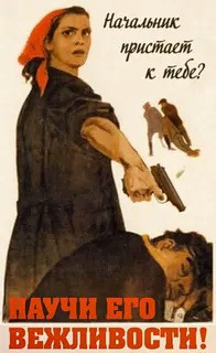 А касаемо опубликованных плакатов : не хочется уже быть циничной и высмеивать все эти агитационные "декларации" - в 90-е достаточно поглумились над историей. Ну - было, из песни слов не выкинешь. Как говорил наш незабвенный Виктор Степанович "Хотели как лучше..." Но плакат "Начальник пристает к тебе? Научи его вежливости!" - просто шедевр какой-то!