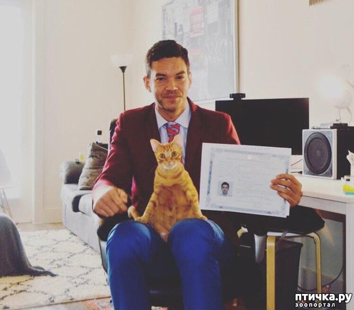 «Очень горд тем, что наконец получил гражданство США. Хочу отпраздновать это событие с моей маленькой преданной подружкой, которую нашел у себя дома полгода назад. Она привила мне любовь к кошкам и сегодня впервые попробует сырую рыбу».