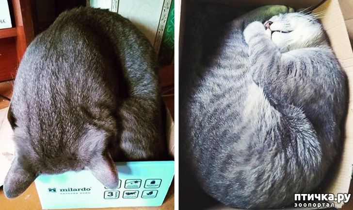 «Это мой Федя 3 года назад. Он тогда свою коробку съел, я ее выбросил, а он нашел другую, размером 20? 20, и туда трагично, с трудом угнездился. Я посмеялся, конечно, но вскоре нашел ему новую, побольше, она на второй фотографии».
