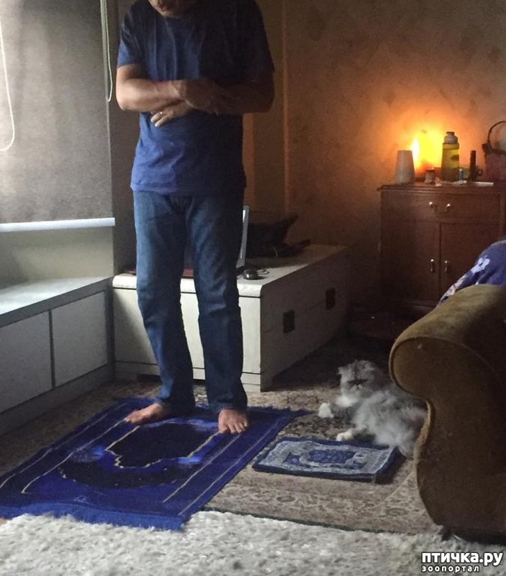 «Мама прислала фото того, как папа пытается избавить себя от приставаний кота во время молитвы. Подарил ему собственный молитвенный коврик. Вроде работает».