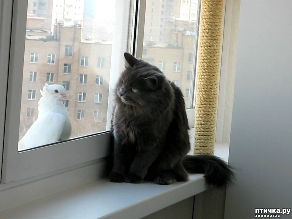 Наш кот не реагирует на такие разборки никак. А вот челюсть нижняя трясется когда видит Майн. На голубок спокойней реагирует.