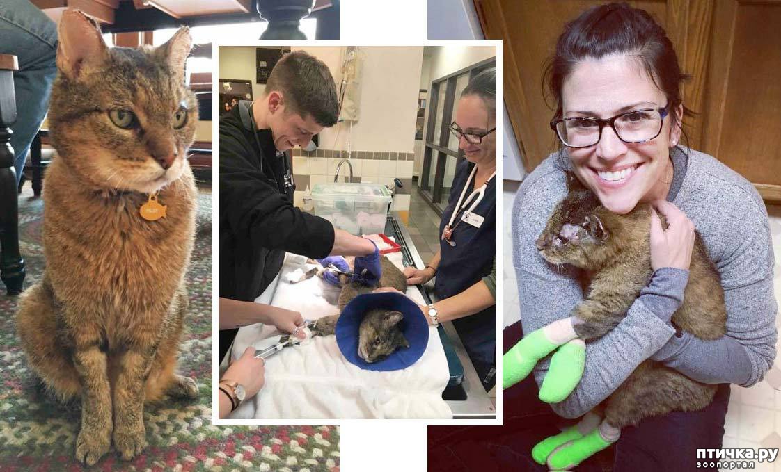 Оказалось, что старого котяру спасли во время лесных пожаров в Калифорнии. Хвостатый сильно обгорел, и добрые люди отвезли его в ветклинику. В больнице сразу же просканировали микрочип, который был вживлён в холку животного 10 лет назад, и позвонили по закреплённому за чипом номеру телефона.