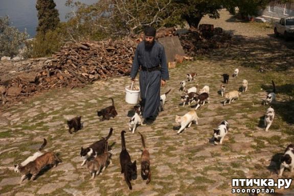 Вот как один из монахов описывает в своих путевых заметках процесс кормления котов на Афоне: «Выносит монах из трапезной длинное ведро, стучит в него - и тут же со всех сторон мяуканье: кошки собираются. Откуда они только берутся? Штук сорок! Выстраиваются плотными рядами вокруг монаха. Они начинают виснуть на ведре, на рукаве, на монахе. Кошки вообще молодцы, едят сухари, картошку, очистки. Постятся даже, как и монахи. Словом, настоящие монашеские коты, поджарые такие», - пишет паломник.