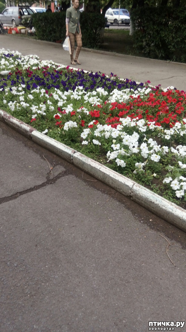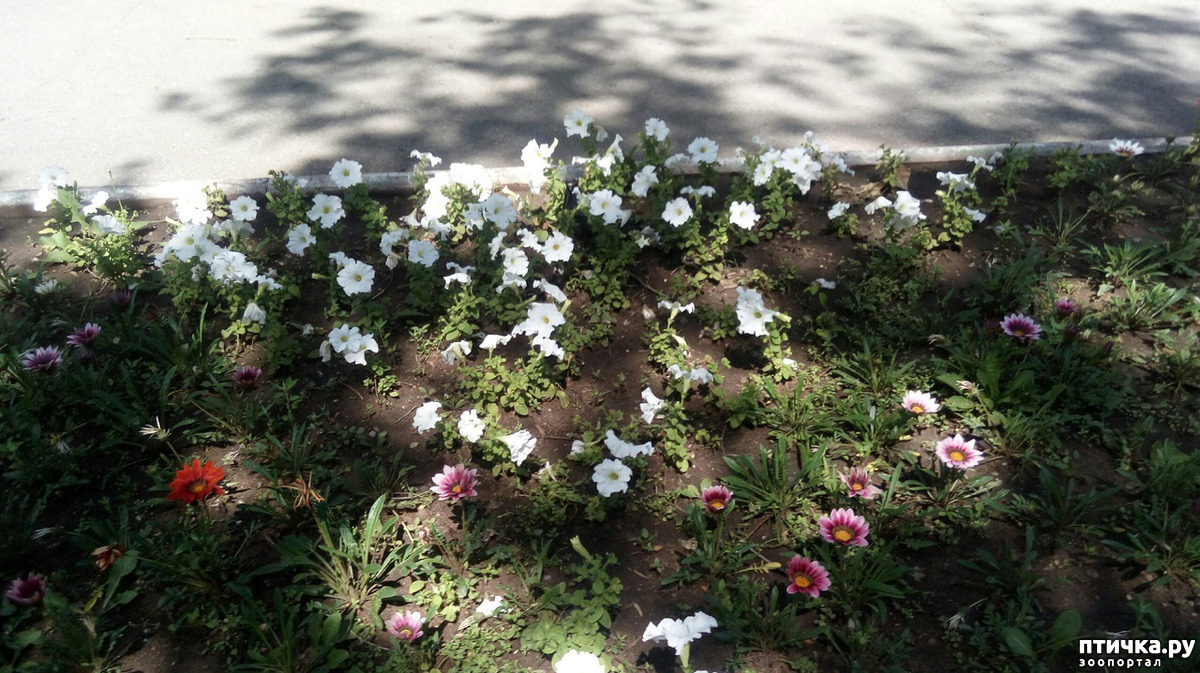 Интересно было наблюдать, как они клювы суют сначала в серединку цветка, а потом пощипывают весь стебелек петунии. В земле они тоже находили много чего полезного для себя. Как я ни пыталась поближе и получше сфотографировать этих птиц, получилось не очень, но если хорошенько приглядеться, можно увидеть голубя, который всерьез занимался цветами