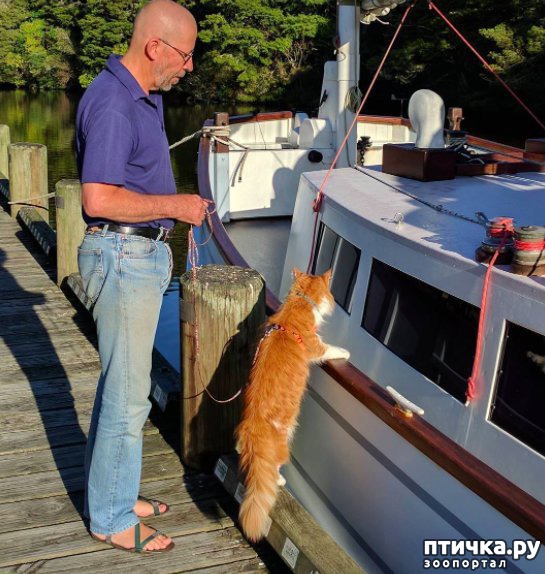 С тех пор прошло много дней, в которых были разные путешествия – большие и маленькие, трудные и легкие, но всегда увлекательные. Скэтти несколько раз довелось упасть в воду, но Пол успевал прийти на помощь питомцу и вовремя высушивать его полотенцем.«Каждое утро Скэтти встречает на палубе, играет и наблюдает за птицами пару часов, потом он идет завтракать, а потом спать. А между часами дремоты он участвует во всех делах, что я делаю. По вечерам он становится наиболее активным и начинает гонять по лодке и по вещам в ней, иногда останавливаясь и замирая с таким видом, словно увидел дьявола» – делится с улыбкой Пол.