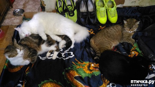 Пес со временем привык к этому зоопарку, живем все дружно. Девчонки иногда шипят друг на друга, на то они и женщины… А мы с Цезарем особо не обращаем внимания на их женские разборки. Руша, как и раньше, чаще держится особняком… видимо происхождение породистое дает о себе знать. А мы, дворяне, живем колхозом, спим и играем вместе, иногда получая взбучку от надменной красавицы Рушель..