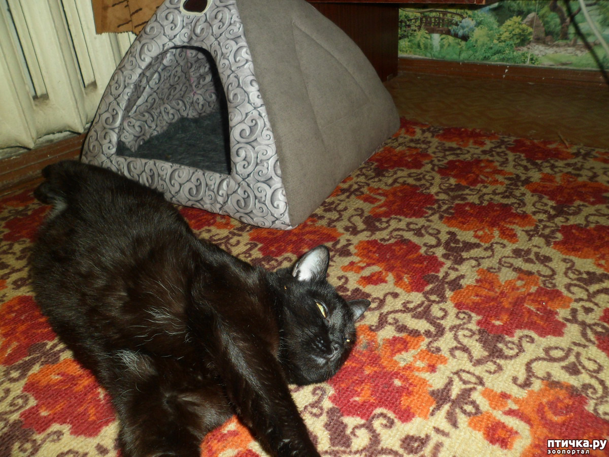 Мы только поворачиваем домик ее так, как нам нравится, а кошке это нипочем - какая разница откуда вход, лишь бы хоромы были теплые и свободные