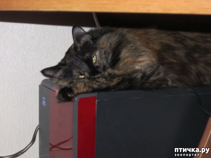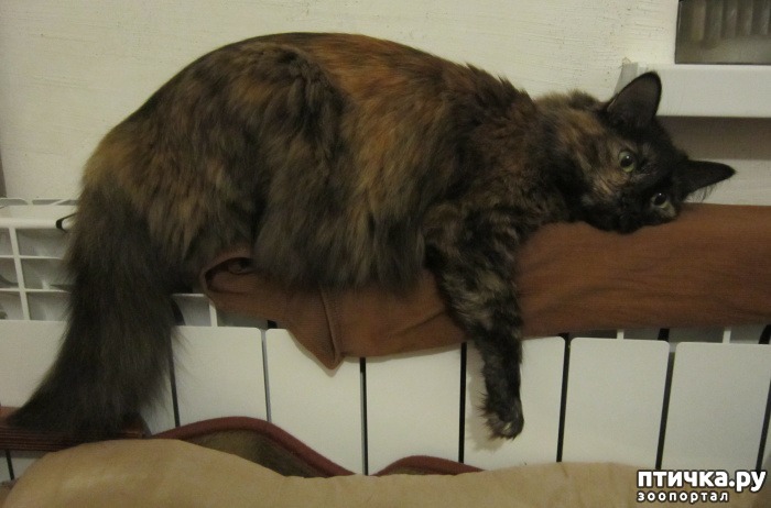Жили мы на тот момент на девятом этаже дома малосемейного общежития в своей однокомнатной квартире. Но была она очень холодной, ни замена батарей, ни установка пластиковых окон тепла не добавили – батареи еле грели, технические проблемы насосной башни, так нам всё время объясняли мастера. Поэтому почти постоянно у нас был включен обогреватель, одевались мы тепло, а для кисы Буси я сшила теплую лежанку и дополнительно она выбрала еще пару теплых мест – системник компьютера, напрмер, лежала на нём, как на печке. Когда компьютер не работал, она спала в гнезде из пледа. Так хорошо маскировалась, что не всегда можно было её отыскать. Пробовала она еще спать на старом большом компьютерном мониторе и старом телевизоре, но после нескольких соскальзываний с них во сне, отказалась от этих мест. Больше всего она любит с тех пор обниматься с горячей батареей или лежать под обогревателем в непосредственной близости.