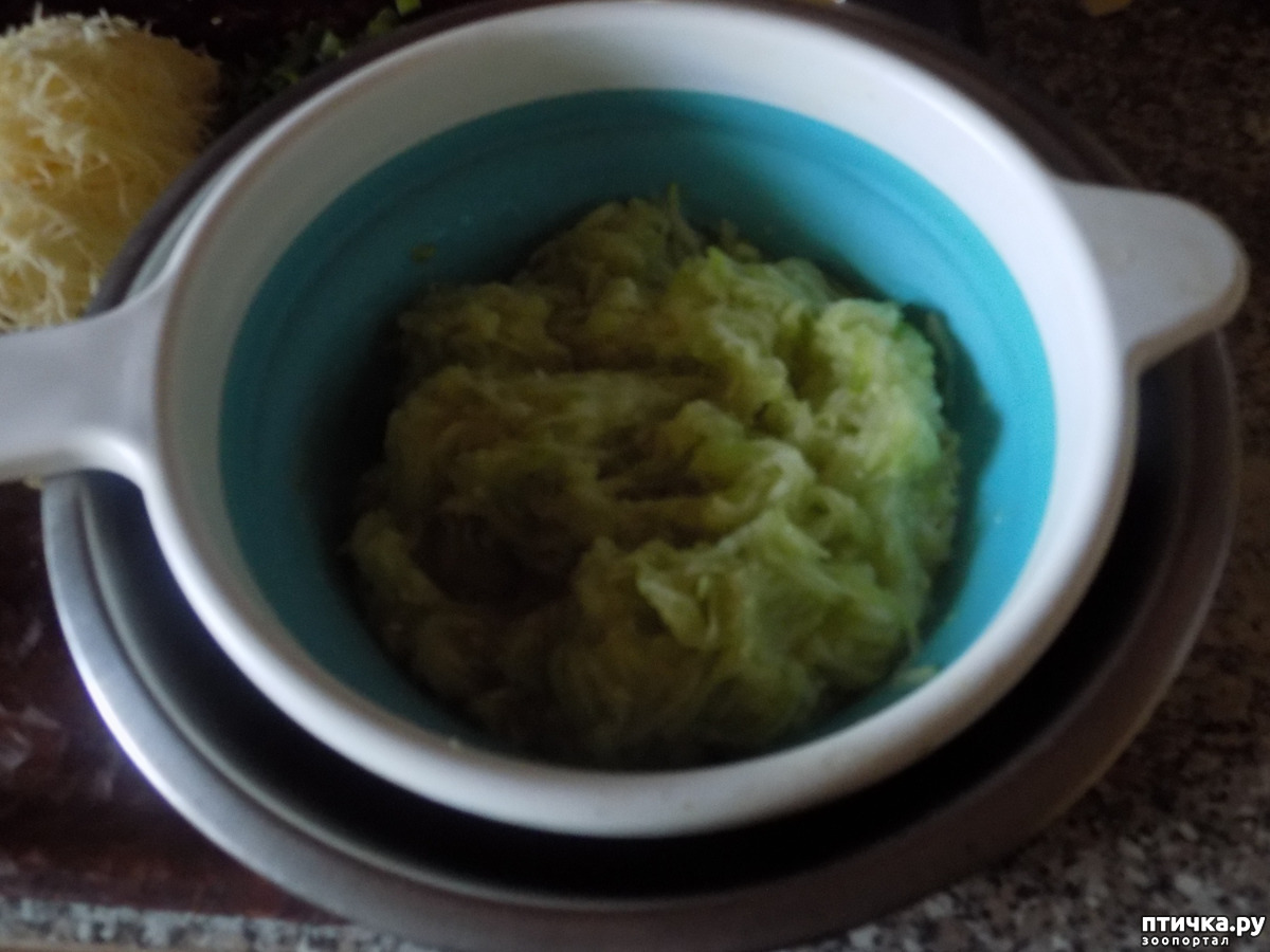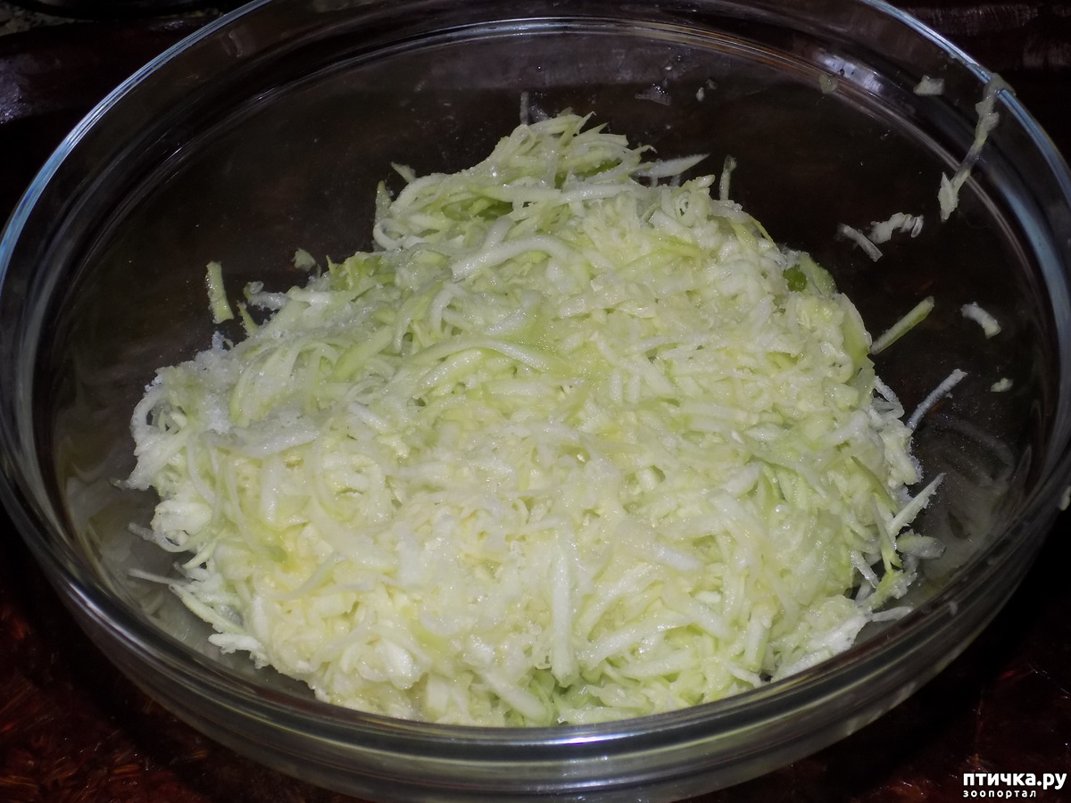 Хорошо отжатые кабачки выкладываем в ёмкость..
