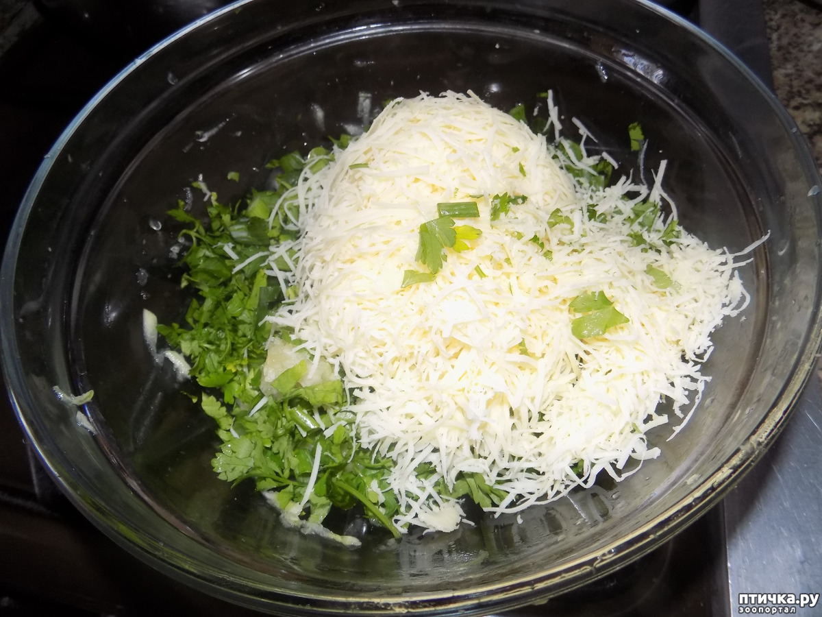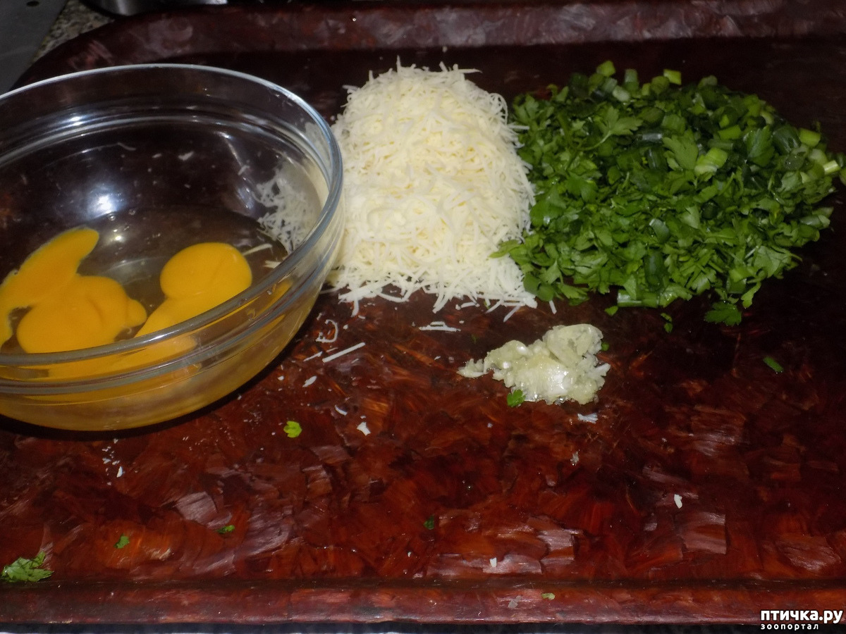 За то время, пока у нас из кабачков отходила жидкость, мы успеваем натереть на тёрке сыр, почистить чеснок и нарезать зелень. В отдельную мисочку разбиваем яйца и немного взбиваем их вилкой.