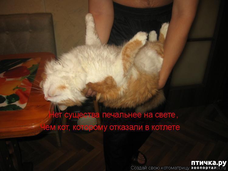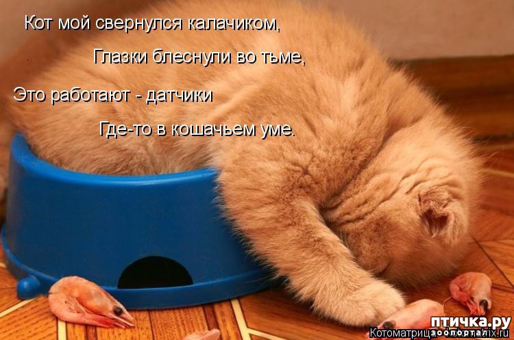 "Хозяева орут на меня и сетуют, что я постоянно притворяюсь гололдным. ну, скажите вы мне, а где они видели сытых котов? Бестолковые, честное кошачье слово! Да, сытых котов просто не бывает! И если кот притворяется сытым, значит он просто случайно заснул".