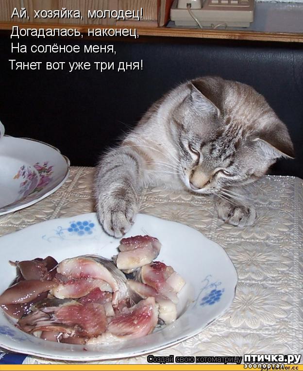 Сегодня у нас такое холодное серое утро... Хочется начать это, подпорченное погодными условиями, утро с чего-нибудь согревающего. Ну, к примеру, с тёплого и душевного юмора. А для более конкретной и тёплой задушевности я выбрала тему о котах, которые "не любят" поесть.