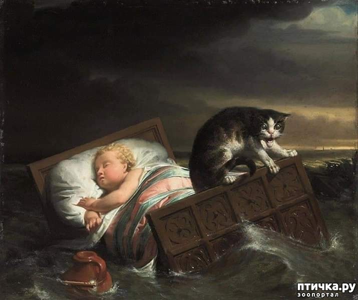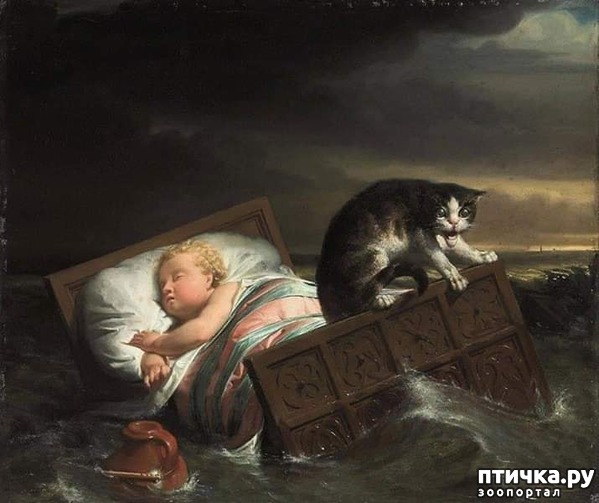 Каково же было общее удивление, когда в колыбели обнаружился мирно спящий (!) младенец - и кот, который прыжками с края на край поддерживал равновесие колыбельки так, что постелька ребенка оставалась сухой и он даже не проснулся среди бушующих волн.