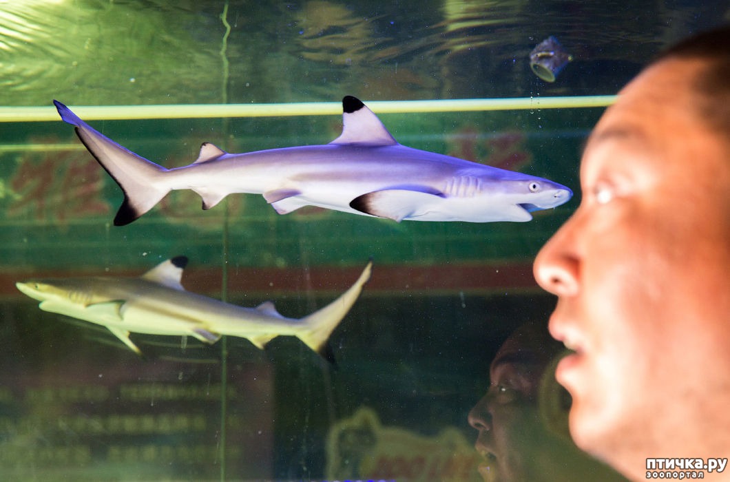 15)38-летний Цзянь Вэй перед аквариумом с черноперыми рифовыми акулами.