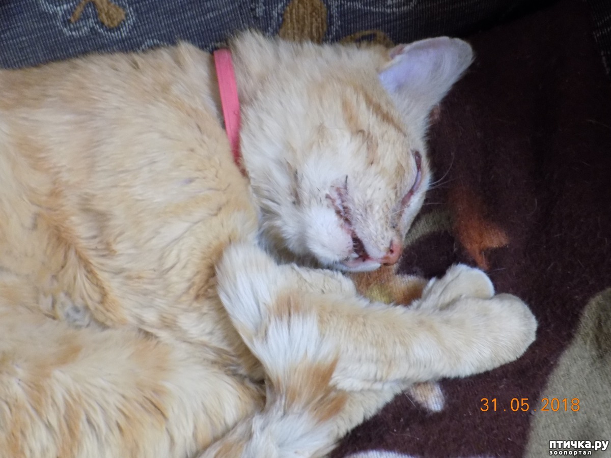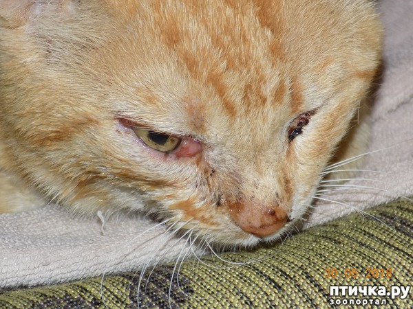 Глаз у кота был окровавлен, из пасти текла кровь... Страшное зрелище, скажу я вам. Занесла раненого домой. Дома никого, помочь некому. Не могла сообразить, с чего начинать. Из пальца ручьём льётся кровь. Перепачкала кровью всё, что могла. Перекисью пытаюсь остановить кровотечение. Не получается. Завязываю туго бинтом и берусь за кота. Девочки, дорогие мои, если бы видели это раненое недоразумение... С глазом конечно беда. Не знаю, будет ли видеть на этот глаз. Серьёзное дело. Пасть порвана, внутрь заглянуть не даёт. Одним словом, страсти ещё те! Ну, теперь мы лечимся, пьём антибиотик, капаем глаза, промываем пасть ромашкой и едим с ложечки насильно, ибо аппетит отсутствует вообще. Такие, вот, печальные дела у нас... Теперь лежит наш несчастный, пострадавший в процессе бандитского нападения, отстаивая свои территориальные приоритеты.