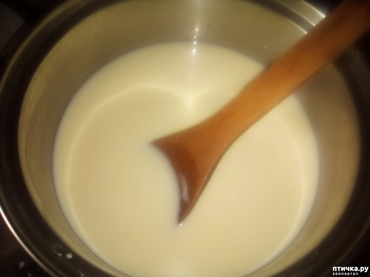 Молоко довести до кипения и влить в кипящее молоко массу с яйцами и сметаной, добавить соль. Деревянной ложкой постоянно помешивать до образования крупных хлопьв.
