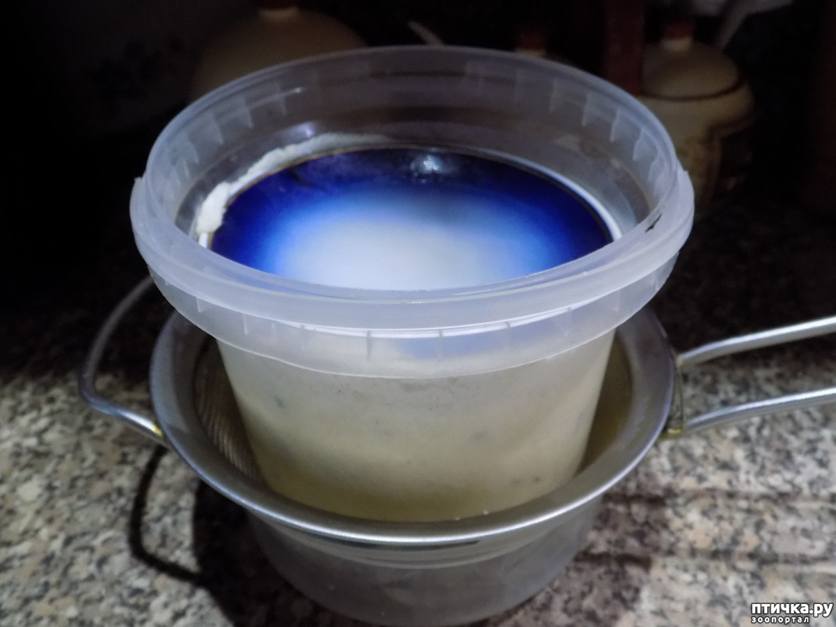Затем, закрыть кастрюлю крышкой и оставить минут на 15-20. Далее, слить содержимое кастрюли в сито, застеленное марлей в два слоя. Дать постоять, чтобы ушла вся сыворотка. Оставшуюся в сите массу переложить в контейнер с дырочками на его донышке. У меня обычное ведёрко из-под майонеза, на дне которого я сама сделала проколы. Установить контейнер на сито, а сито погрузить внебольшую ёмкость, чтобы в неё уходила оставшаяся сыворотка.