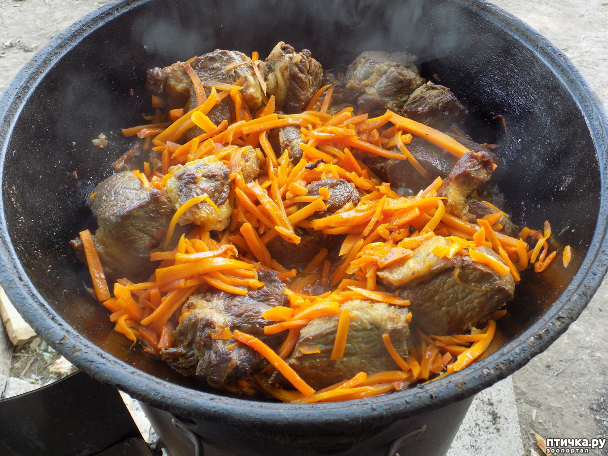 Ещё одна новинка-изюминка в приготовлении плова: мясо наш шеф-повар готовил отдельно и только потом закладывал морковь и лук. Всё это он доводил до готовности и извлекал из казана.