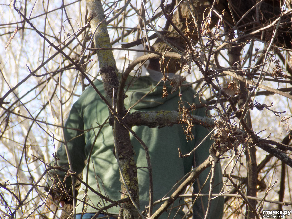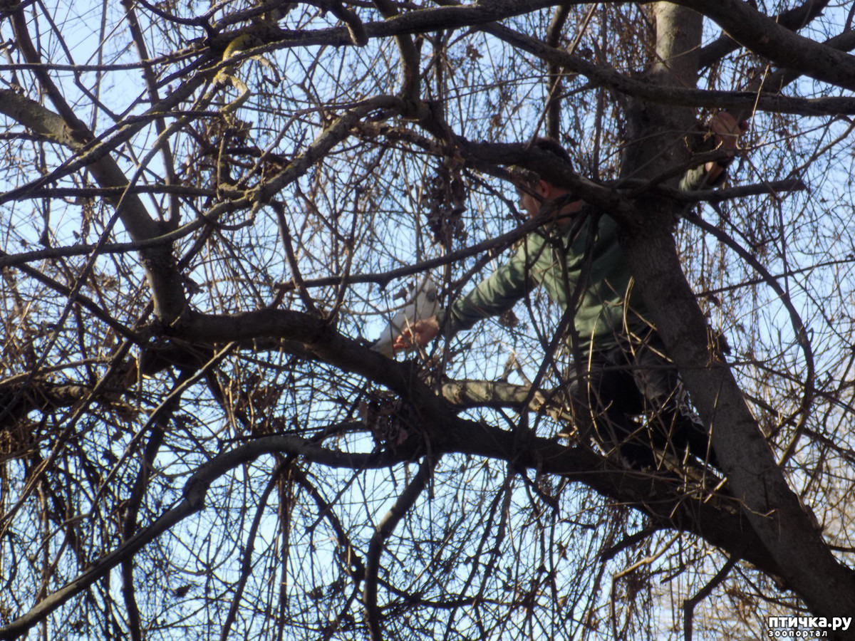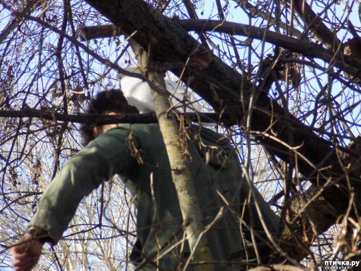 А я сегодня продолжу свой рассказ о событиях 14 марта. И рассказ этот будет о том, как Котофей заставил всех нас изрядно поволноваться. Ну, как я вам уже писала, день был замечательный, по-ласковому тёплый. А значит, Котя вместе с нами гулял на моём дне рождения. Крылья, сразу оговорюсь, дети подрезали ему за два дня до этого события. Так вот, мы сидим за столом, какадушник на своей любимой жёрдочке. И уж как-то так получилось, что отвлеклись мы на застолье и Котофей на время остался предоставлен самому себе. А когда спохватились, смотрим, а Коти на месте нет. Мы туда, мы сюда, нет какадушника нашего. И тут, вдруг, внук-Олежка показывает нам место, где им был замечен беглец. А беглец наш каким-то образом перелетел через реку и расположился в кронестарой акации.