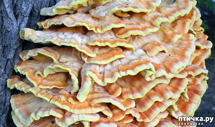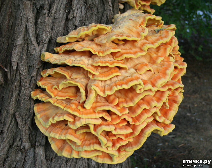 Это необычный гриб, который у нас называют трутовик куриный. Среди огромного количества представителей грибного царства такой гриб, растущий на коре деревьев, известен, как куриный гриб. Посмотрите, какая яркая окраска у этого красавца! Предпочитает этот трутовик куриный только тёплый климат, а потому в наших крымских лесах он прекрасно себя чувствует.