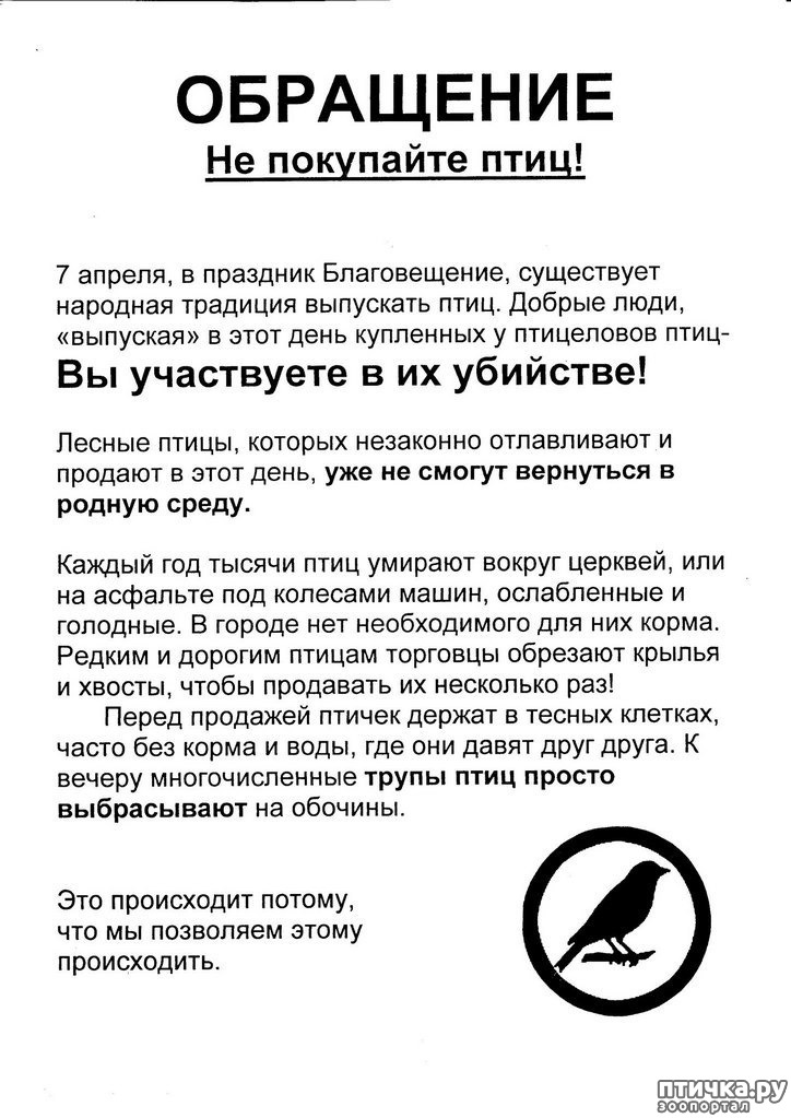 Незаконно отловленные птицы не смогут вернуться в родную среду. В городе нет необходимого для них корма, они погибнут. Птицы, которые перезимовали в клетке, отвыкают жить на воле, быстро теряют навыки добывать пищу и тоже не выживают в природе. Редким и дорогим птицам торговцы обрезают крылья и хвосты, чтобы продавать их несколько раз. Птиц держат в тесных клетках. Птахи отказываются от еды, переохлаждаются, бьются о сетку, ломают перья, разбивают в кровь клювы, слепнут от отсутствия света, получают тяжелейший стресс.