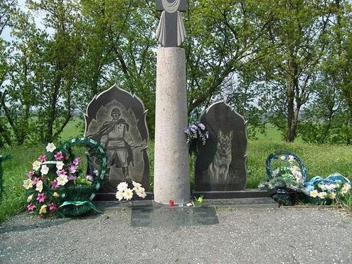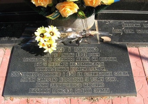 «Остановись и поклонись. Тут в июле 1941 года поднялись в последнюю атаку на врага бойцы отдельной Коломыйской пограничной комендатуры. 500 пограничников и 150 их служебных собак полегли смертью храбрых в том бою. Они остались навсегда верными присяге, родной земле».