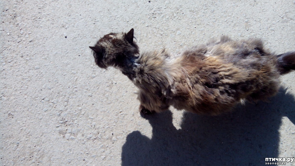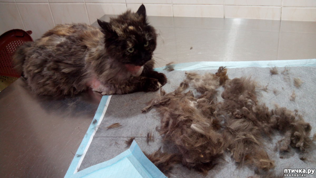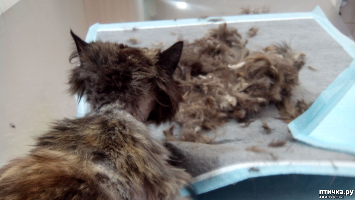Внешне кошка, конечно стала выглядеть ужасно. Хотя она и сама повыгрызала себе шерсть уже до этого - страшно смотреть.
