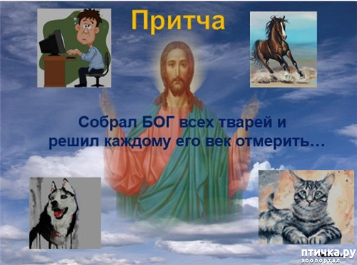Позвал собаку:«Тебе, собака, 30 лет назначаю!»А собака: «Господи, помилуй! Ну куда мне 30 лет на цепи сидеть, гавкать на каждого да кость грызть... Давай мне 15, а остальные человеку отдай». А Богу что? Отдал еще 15 лет человеку.