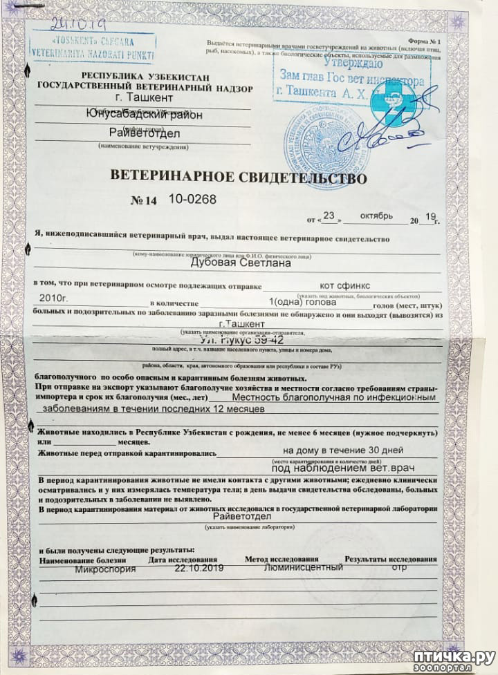 За день до отлета отправились в клинику на осмотр и получили вот такое ветеринарное свидетельство:
