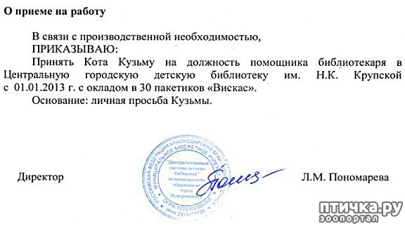 Да что так далеко ходить, аж в Англию. Вот и у нас в Новороссийске кот Кузя был официально принят на работу в детскую библиотеку на должность помощника библиотекаря. В обязанности Кузьмы входит исполнение роли Ученого Кота из «Лукоморья» Пушкина на детских праздниках. Для полного вхождения в роль на шею четвероногому актеру надевают галстук-бабочку. Кот появился в библиотеке в октябре 2012 года. Сперва он просто гулял рядом со зданием. Затем заведующая библиотекой, чтобы кот не замерз, велела сотрудникам либо забрать его домой, либо взять на работу. По своему желанию ночует Кузьма на улице, но в начале рабочего дня наряду с остальными служащими приходит в библиотеку. Есть у кота-библиотекаря и специальное жалование: 30 пакетиков кошачьего корма в месяц. И прием Кузьмы на работу, и его оклад утверждены особым приказом, заверенном печатью учреждения и подписью его директора.